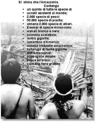 ![]() L' 11% della deforestazione precedente al 1983 è stata causata dai piccoli agricoltori che praticano l'agricoltura migratoria; Due dighe, Tucurui e Balbina, sono da sole la causa dell'allagamento di circa 4.500 kmq di foresta pluviale; Nel solo 1988 è stata distrutta un'area di foresta pari all'estensione del Belgio. (Fonte: istituto mondiale delle risorse). |